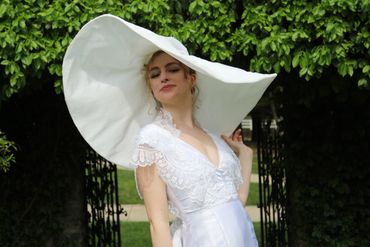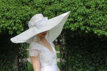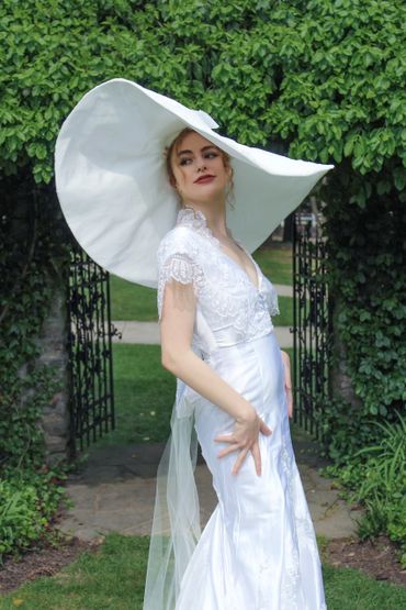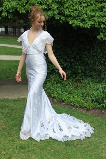 Paula's dress was a full a-line skirt, made up of many yards of fabric. A drastic new shillouette was desired. The new dress would be a fit-to-flare gown. The entire body of the new gown was was able to be made from just the skirt of Paula's dress. The bodice could then be made into a detailed back bow. The sleeves into accessories.