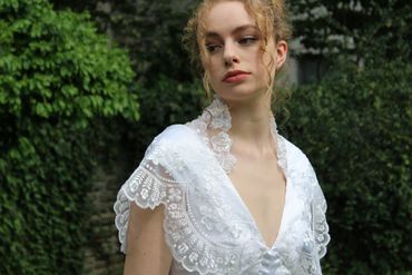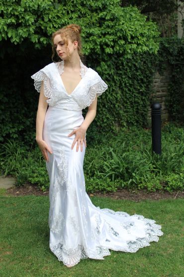 This was the first dress to be made in the collection. It was made using zero-waste techniques, meaning every scrap of fabric was used in the final garment. A muslin dress was draped, then patterned. As you would a regular garment, pattern pieces were cut from the fabric. Not wanting to waste any pieces an uneven seam allowance was left around the pieced and the stitch lines were then hand drawn onto the fabric.