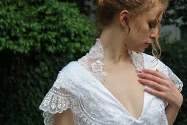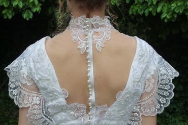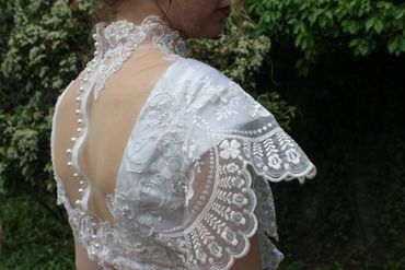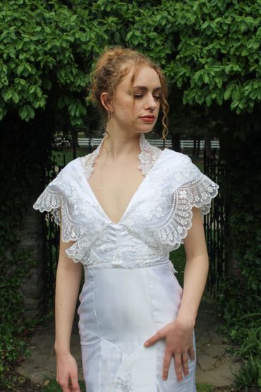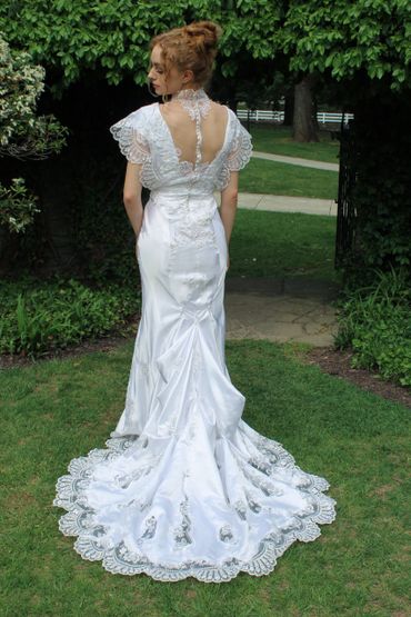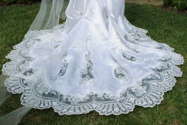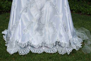 Paula's dress is from 1987. It is made from a polyester satin fabric. The lace appliqués are made from a cotton or cotton-blend fiber. The gown has cutouts throughout the skirt and sleeves that are patched over with appliqué. On top of the appliqué, the gown had hand-sewn pearls and sequins.
