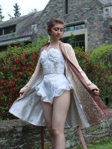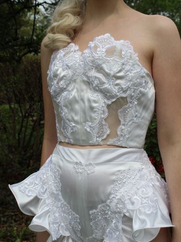 Sharon's dress was used in the getting ready sets look for the dresses smooth and soft satin feel. Both the shorts and corset top were completely made from Sharon's fabric. Decorated in carefully picked-off lace and ruffles. The lining for the robe was made from Sharon's satin and created a major wow factor. Lace motifs left in place to honor the original design.